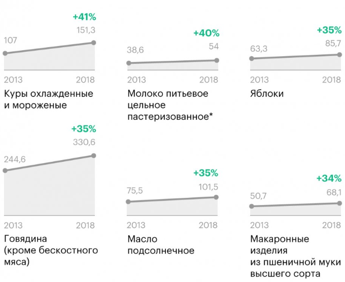 Аналитики оценили и доступность продуктов гражданам. Здесь за последние годы наметилось ухудшение ситуации. Именно потребителю приходится платить самую высокую цену за продэмбарго: цены подскочили на все продукты, а не только на те, что запрещены к импорту.Резко увеличилась стоимость сливочного масла. За последние 5 лет прирост составит 79% рыба. Замороженная рыба подорожала на 86%, белокочанный сорт капусты на 63%. Возросли цены и на продукцию до 2014 года производившиеся в большом количестве в РФ: муку из пшеницы, макаронные изделия, растительное масло. Значительно не подорожал только картофель.